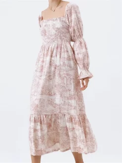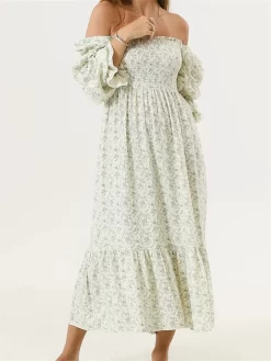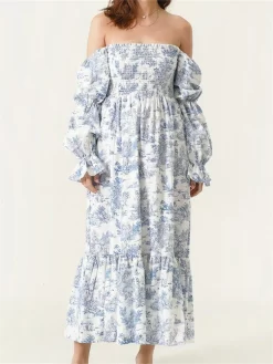 Women’s Autumn Long Beach Dress Long Sleeve Off Shoulder Solid Color/Floral Dress